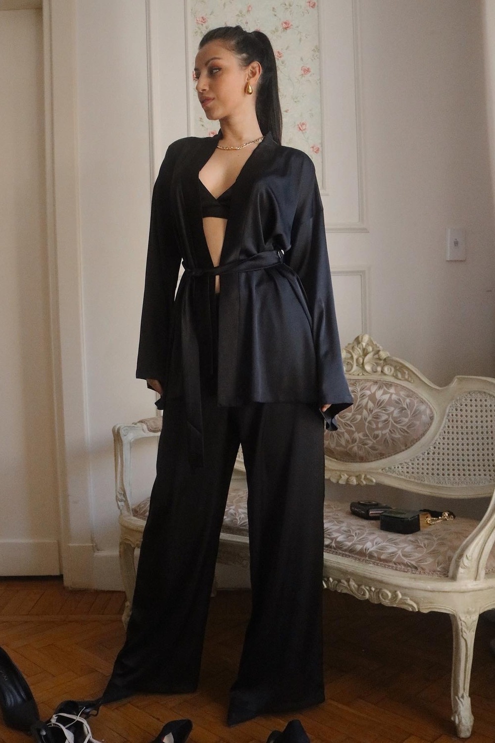 A two piece ultra luxe satin set composed of a kimono-style robe and relaxed fit pants that you can add its third piece to — the bra top for the whole look. Designed to flow with your every move, it’s made for golden hour lounging, midnight musings, or slipping into your feminine power at home.