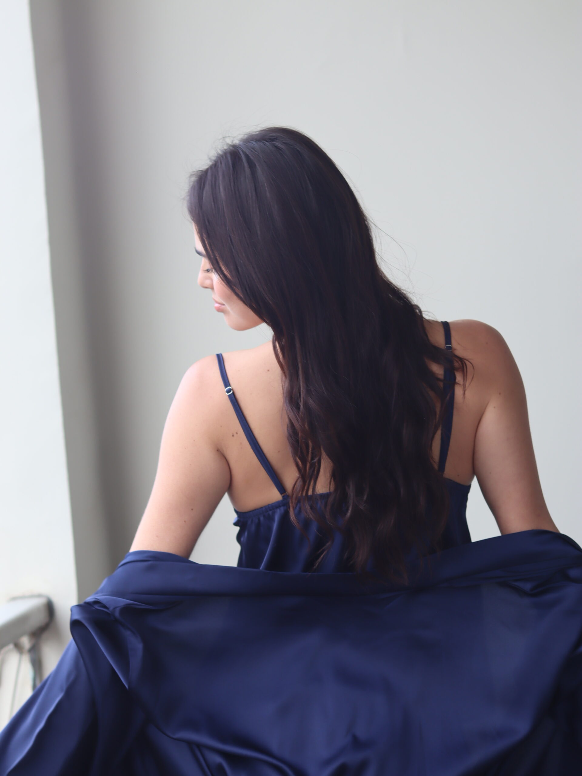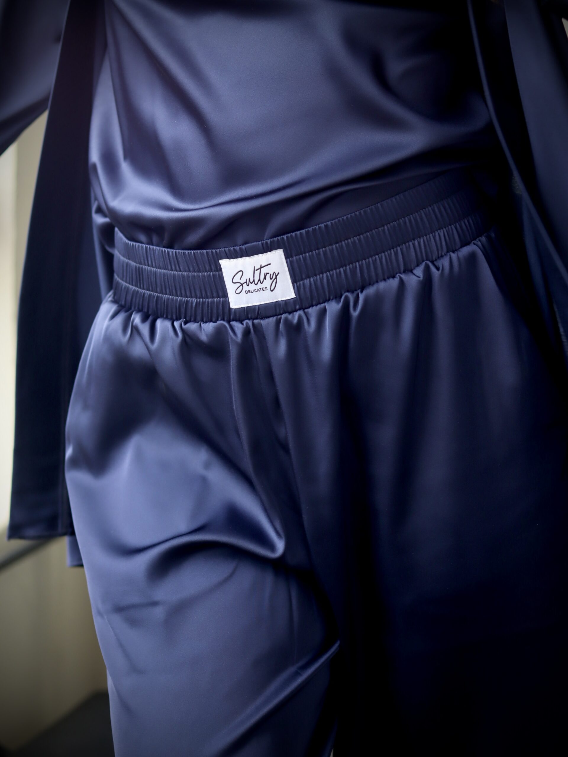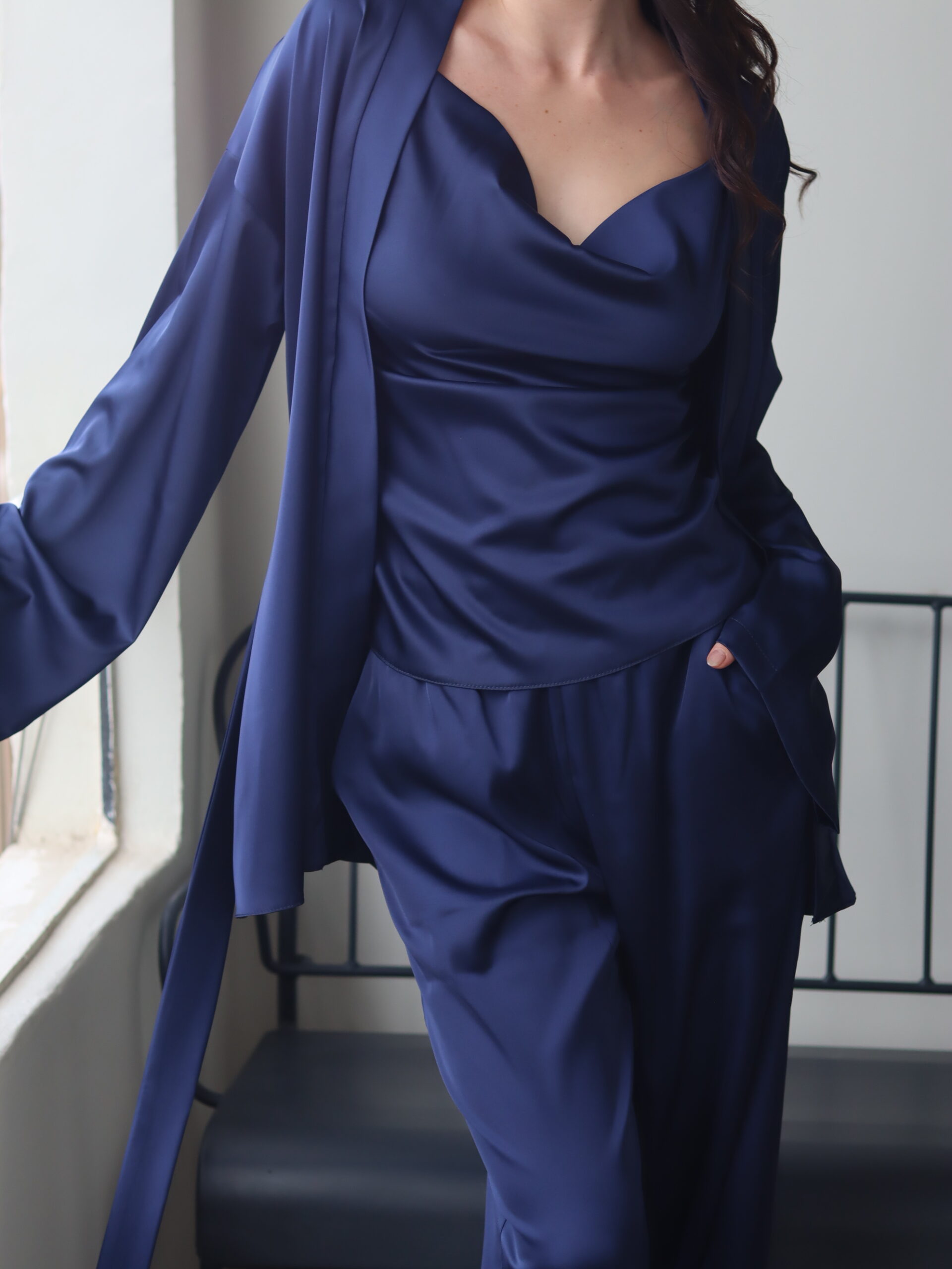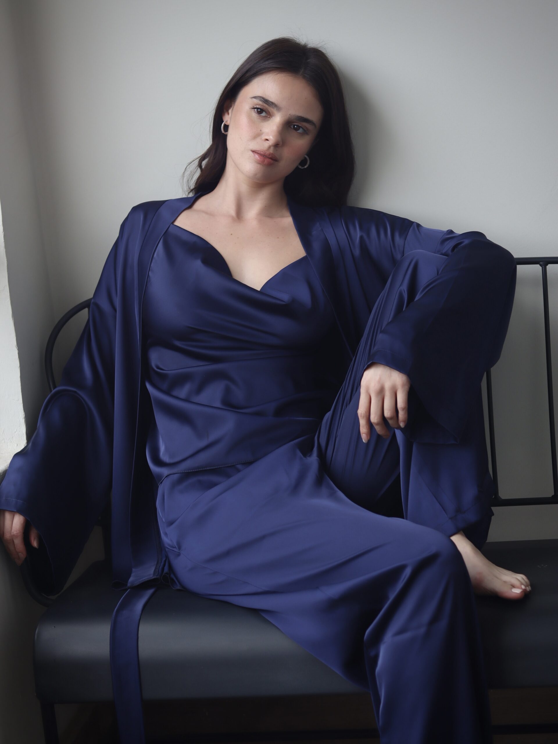 A three piece ultra luxe satin set composed of a kimono-style robe and relaxed fit pants with a cowl neck top. Designed to flow with your every move, it’s made for golden hour lounging, midnight musings, or slipping into your feminine power at home.
